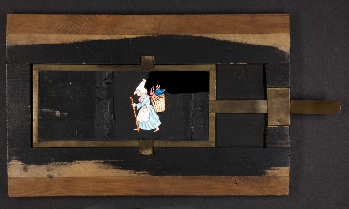 Gumma med korg på ryggen, innehållande grönsaker eller vid bildväxling en flicka och en pojke.