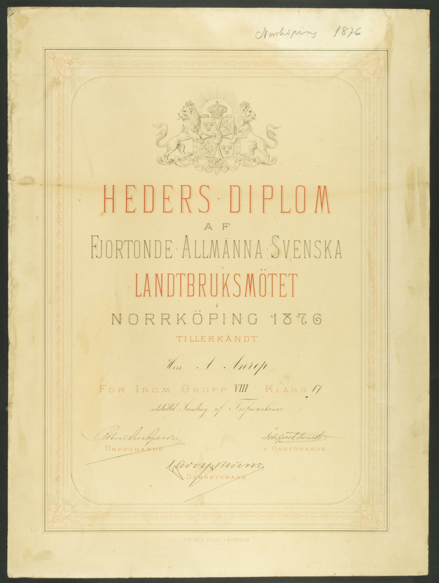 Hedersdiplom, fjortonde allmäna svenska landtbruksmötet, Norrköping 1876, Göteborg, ur boken med ritningar mm 1868-1887, av den svenske torvmaskinkonstruktören Aleph Anrep.