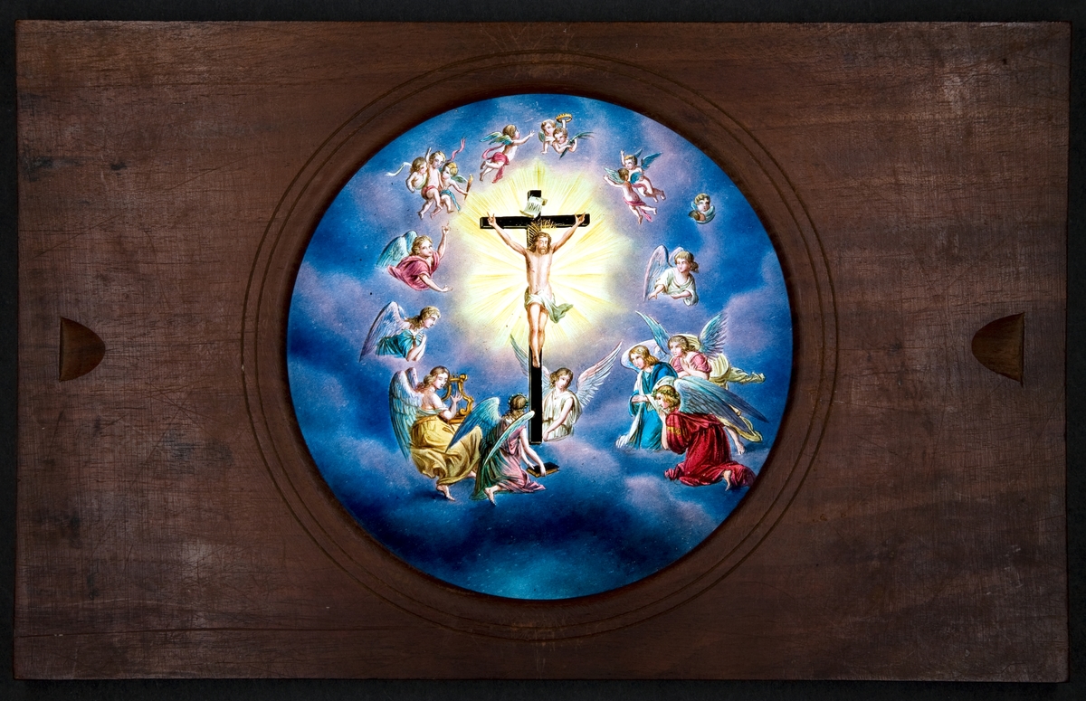 Laterna magica bild målad i färg på glasskiva.