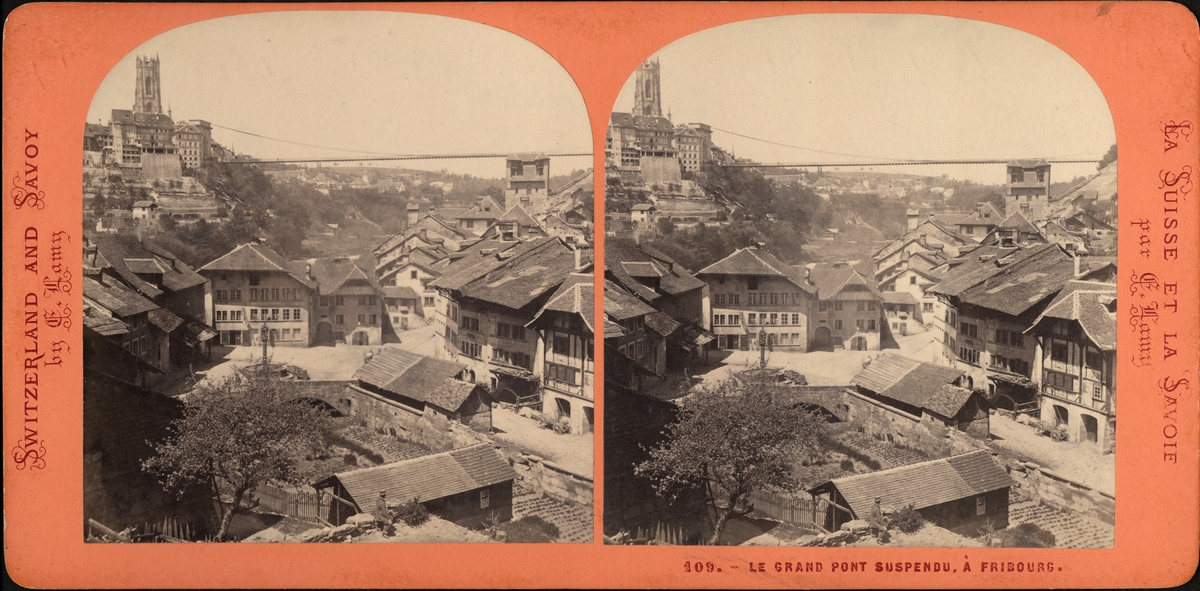 Stereobild, vy över Friburg med bro i bakgrunden.