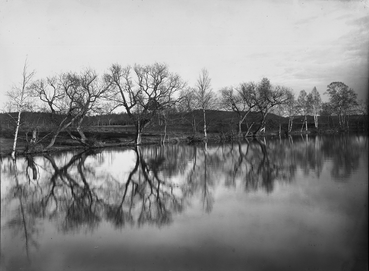 Diapositiv, fönsterbild av landskap, träd invid vatten.