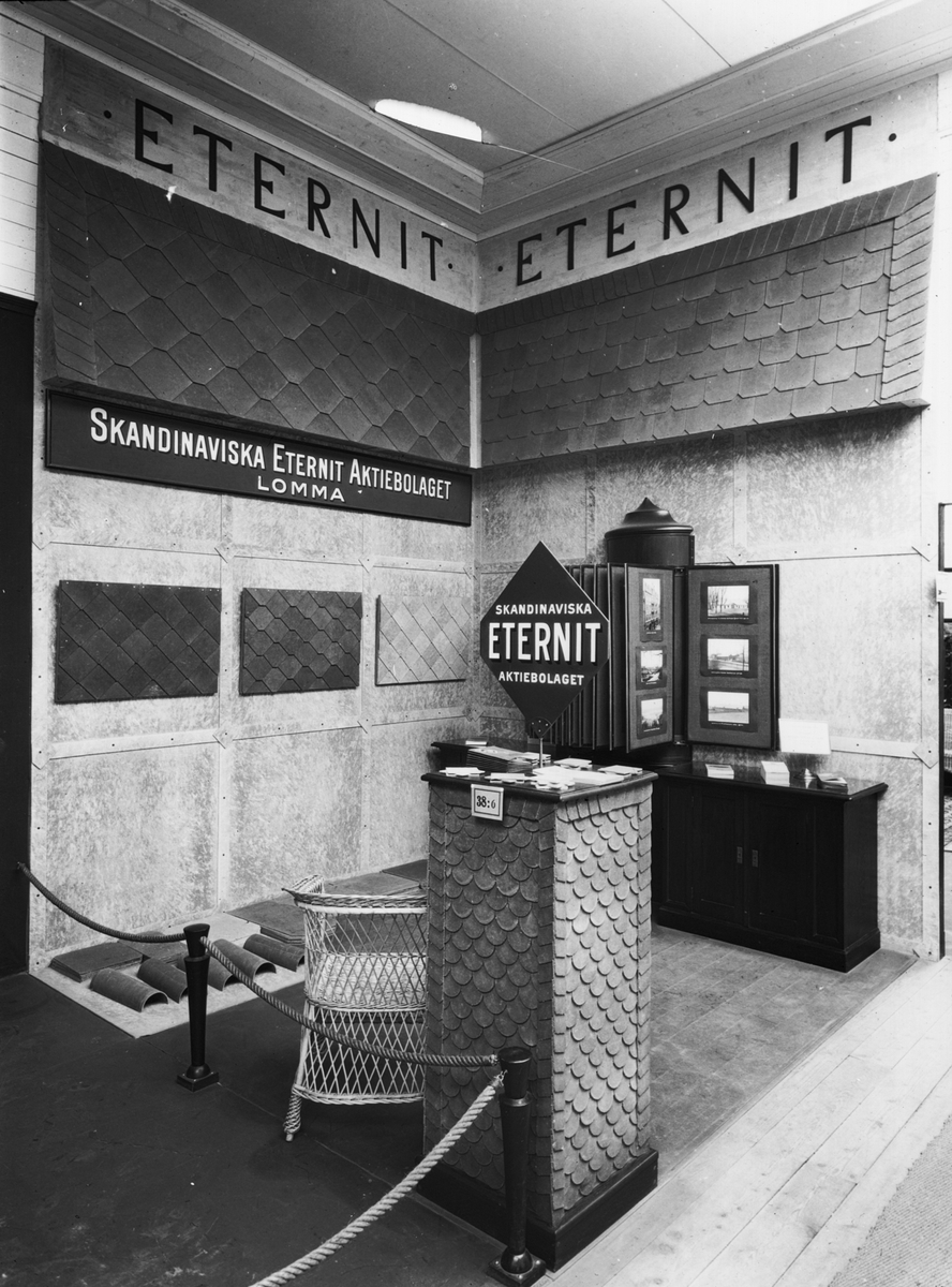 Skioptikonbild med motiv från Göteborgsutställningen 1923. Skandinaviska Eternit AB:s monter.