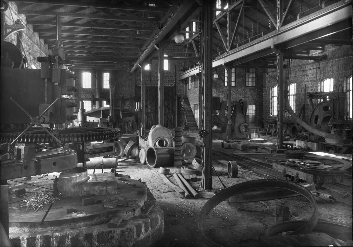 Diapositiv, fotografi av verkstad, troligen stålgjuteri.