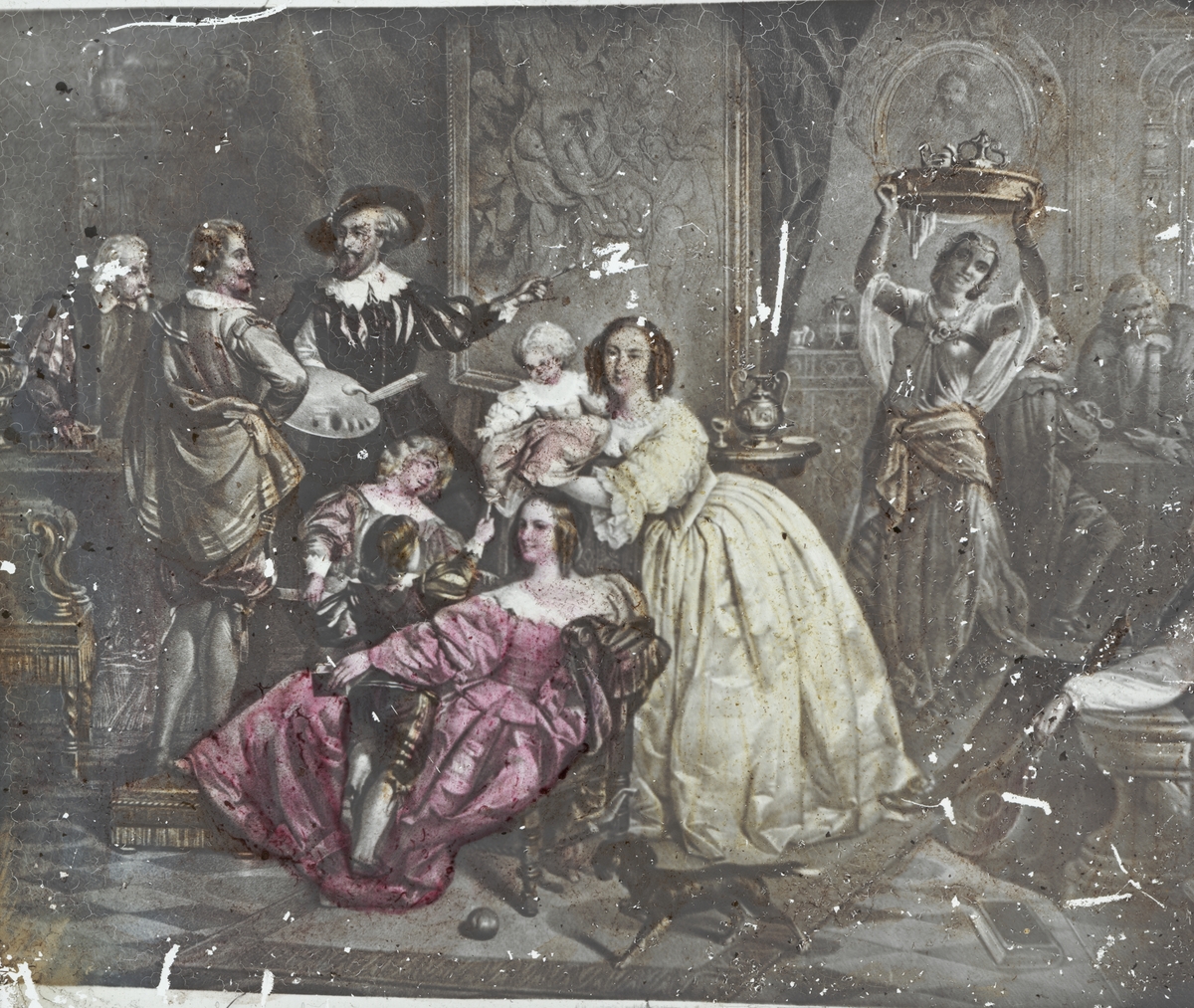 Handmålade ljusbild för skioptikon med motiv av sällskap i överklassen som roar sig.