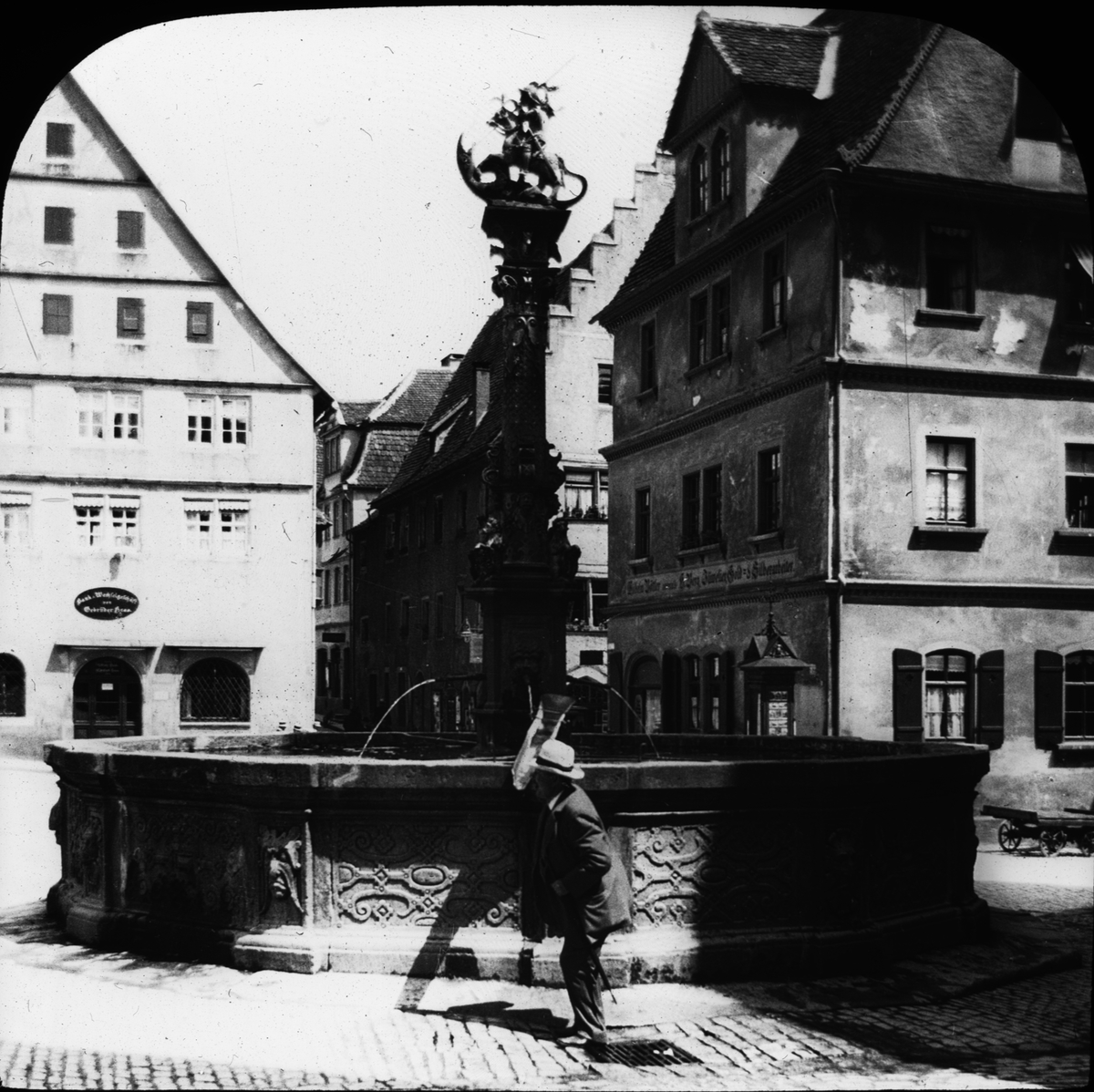 Skioptikonbild med motiv av man vid fontän i Rothenburg.