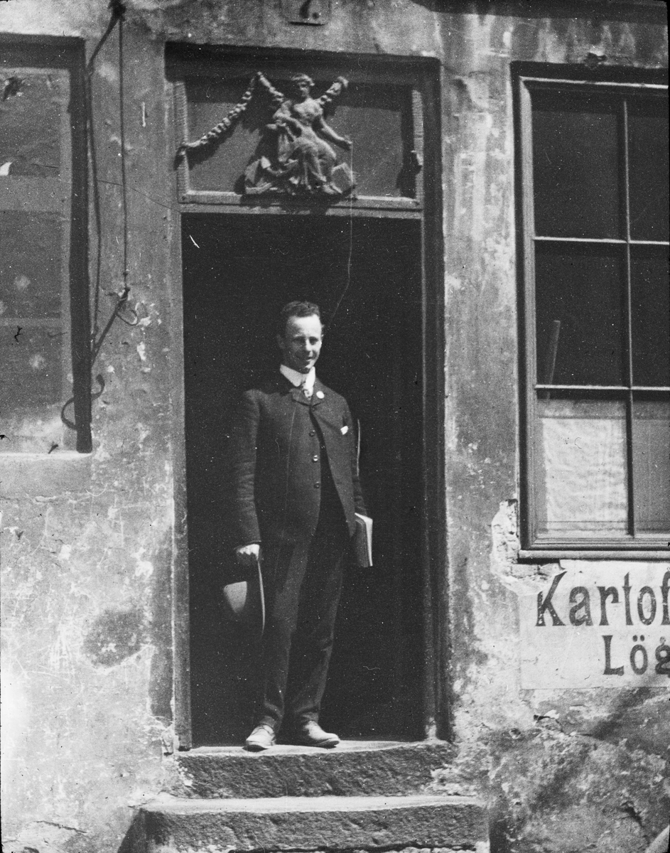 Skioptikonbild med motiv av okänd man i dörren till okänd byggnad, okänd stad.