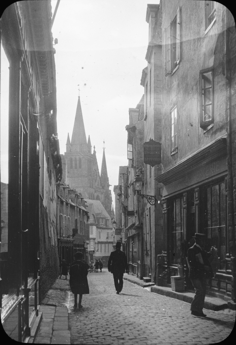 Skioptikonbild med motiv från gränd i Bayeux med katedralen i bakgrunden.