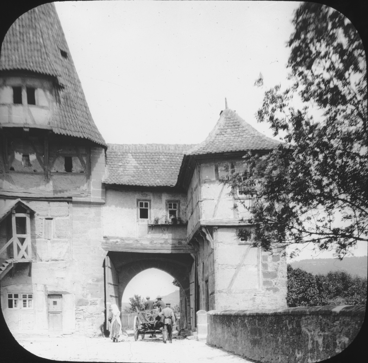 Titel: Skioptikonbild med motiv av Rödelseer Tor, Iphofen. Bilden har förvarats i kartong märkt: ?