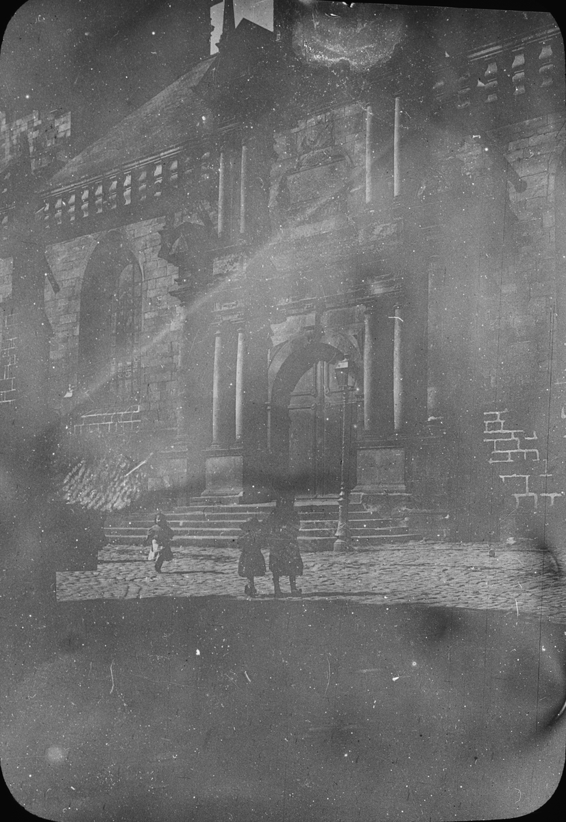 Skioptikonbild med motiv från Sigurd Curmans resor i Europa. Okänd stad.