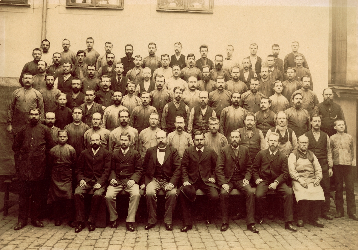 Personalen vid Göranssons Mekaniska Verkstad i Stockholm, omkring 1900.