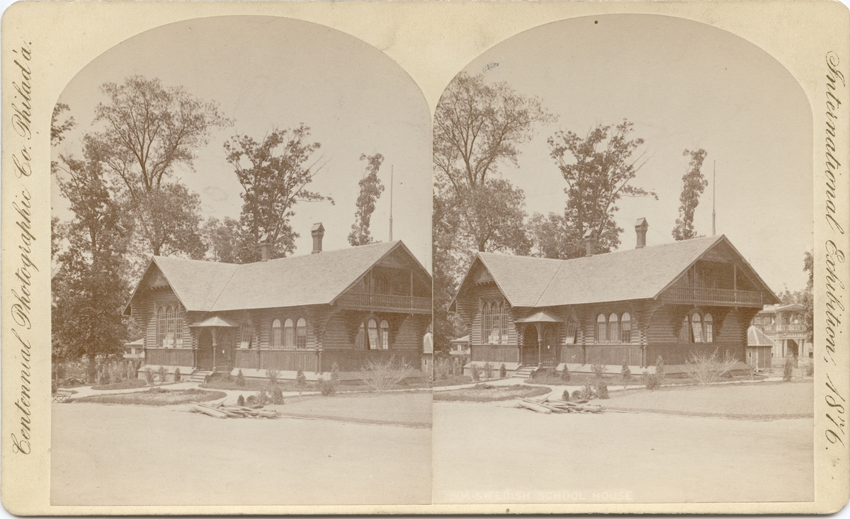 Stereobild med motiv av Svenska skolan, folkskolebyggnad i svenska paviljongen vid Världsutställningen i Philadelphia 1876.