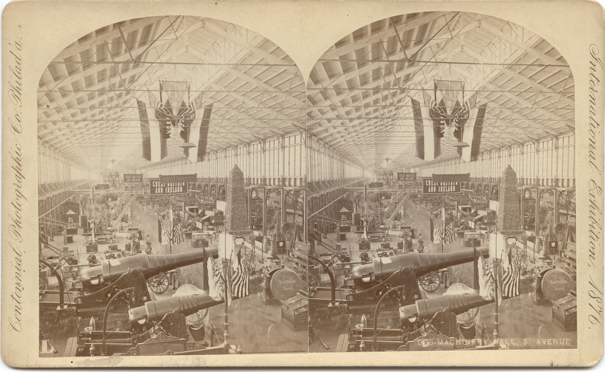 Stereobild med motiv av södra maskinhallen vid Världsutställningen i Philadelphia 1876.