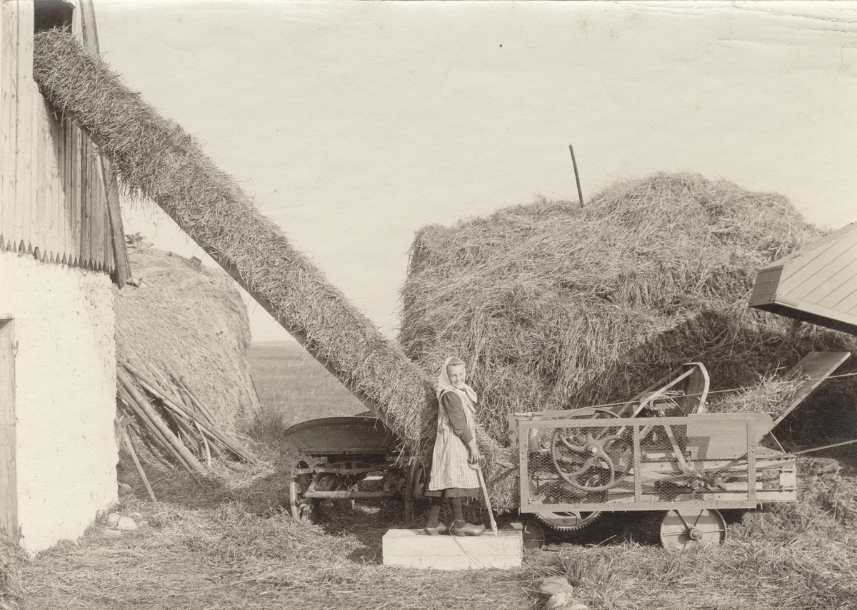 Halmpress kombinerad med tröskverk från Bröderna Anderssons Gjuteri, Skåne. Denna press såld 1910, var ännu i användning 1926. Flickan slår knuten på halmbalarna.