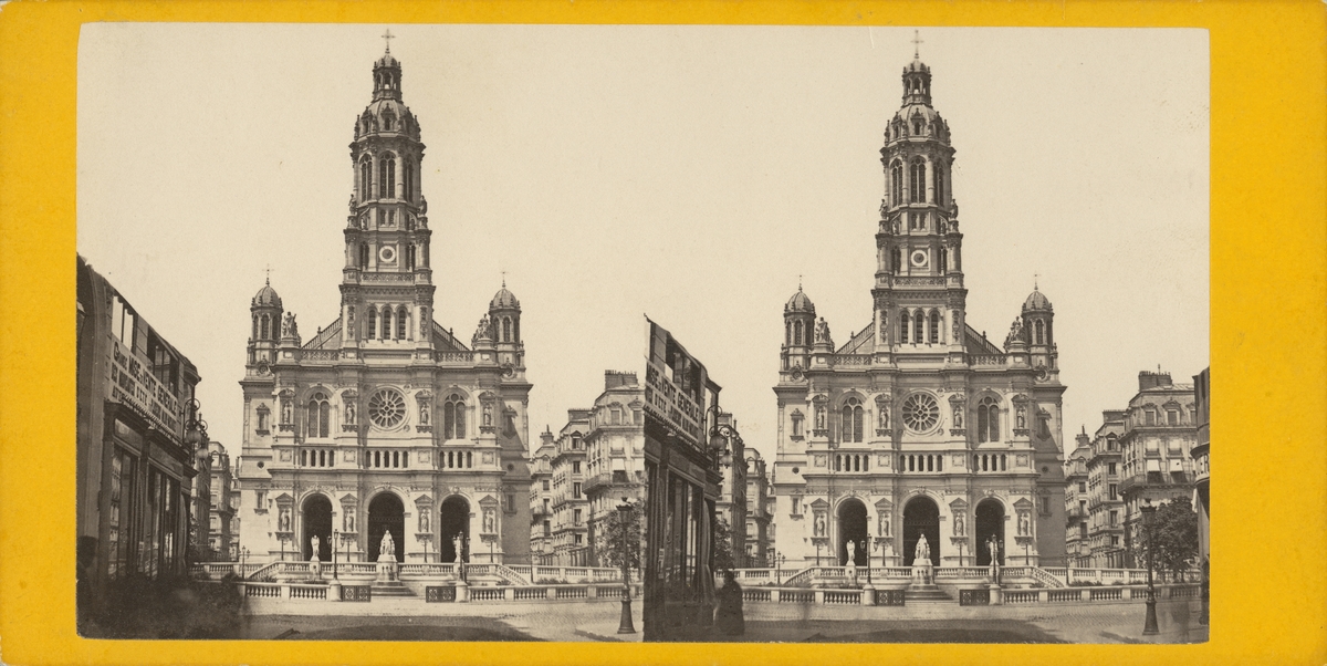 Stereobild med motiv av Église de la Sainte-Trinité (Trinity Church) (Treenighetskyrkan), Paris. Treenighetskyrkan byggdes mellan 1861 och 1867 till en kostnad av närmare 5 miljoner francs. Arkitekt: Théodore Ballu