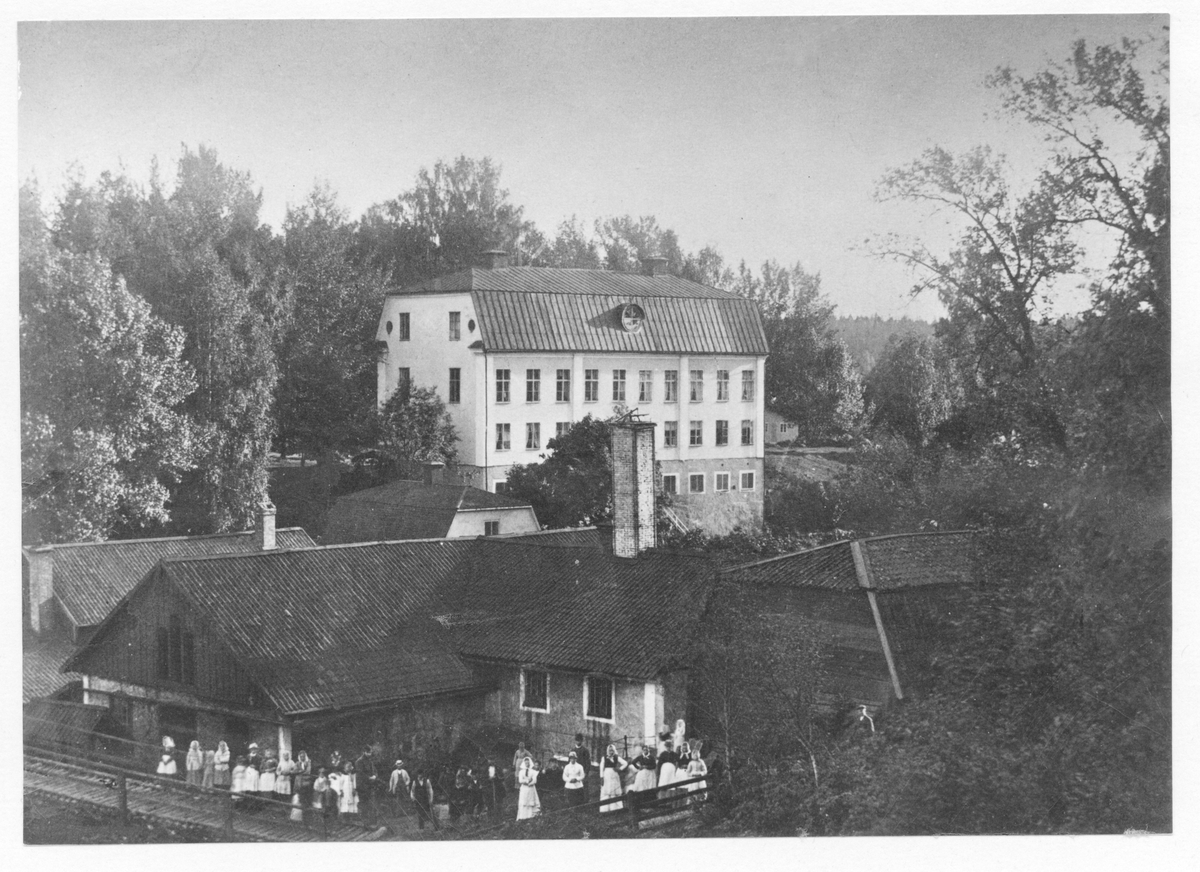 Hagge Bruk. Från vänster taket av spiksmedjan, smältsmedjan och sillboden. Bilden tagen från "Skottens" omkring 1880. >>