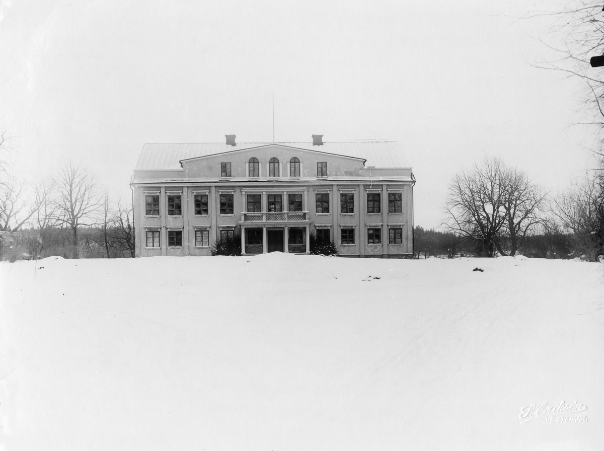 Herrgården vid säteriet sista vintern då ännu detta fanns kvar, omkring 1902. Huset stod tomt när bilden togs. Flyglarna å båda sidor ligga strax utanför bilden, dessa finnas ännu kvar (1926). >>