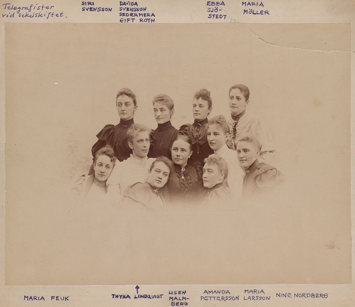 Telegrafister vid sekelskiftet. Troligen från en kurs. Övre raden f.v. Siri svensson, Davida Svensson sedemera gitt Roth, Ebba Möller. Nedre raden f.v. Maria Feuk, Thyra Lindqvist, Lisen Malmberg, Amanda Pettersson, Maria Larsson, Nine Nordberg.