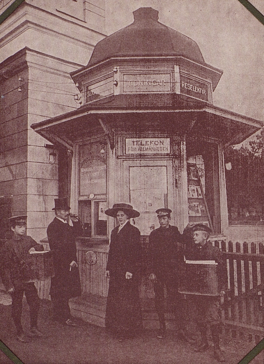 Pressbyråns telefonkiosk. Norrköpings Central, 1910.