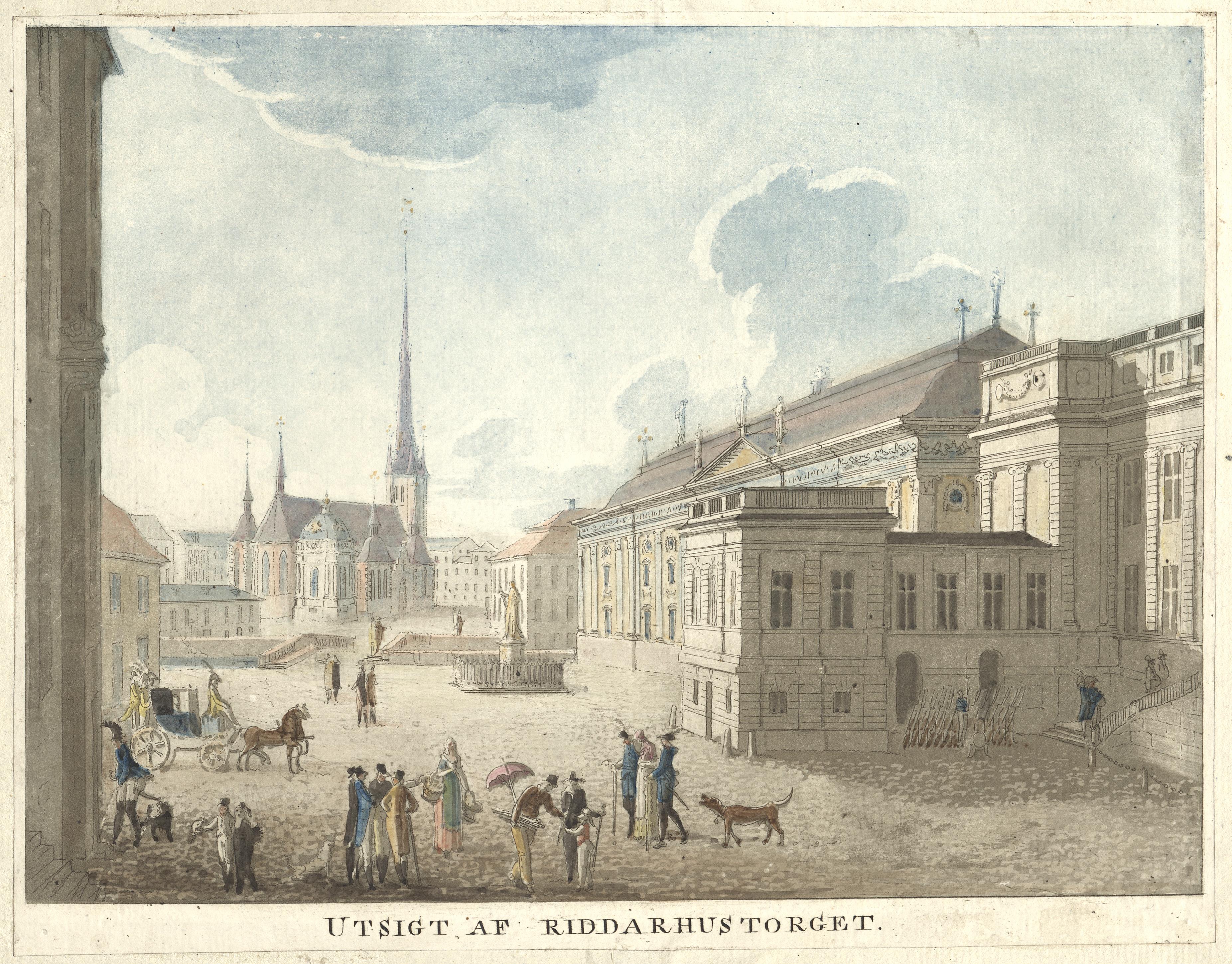 Riddarholmskyrkan i bakgrunden, Riddarhuset till höger. Akvarellerad konturetsning troligen av Carl Gustaf Eckstein från 1790-talet.