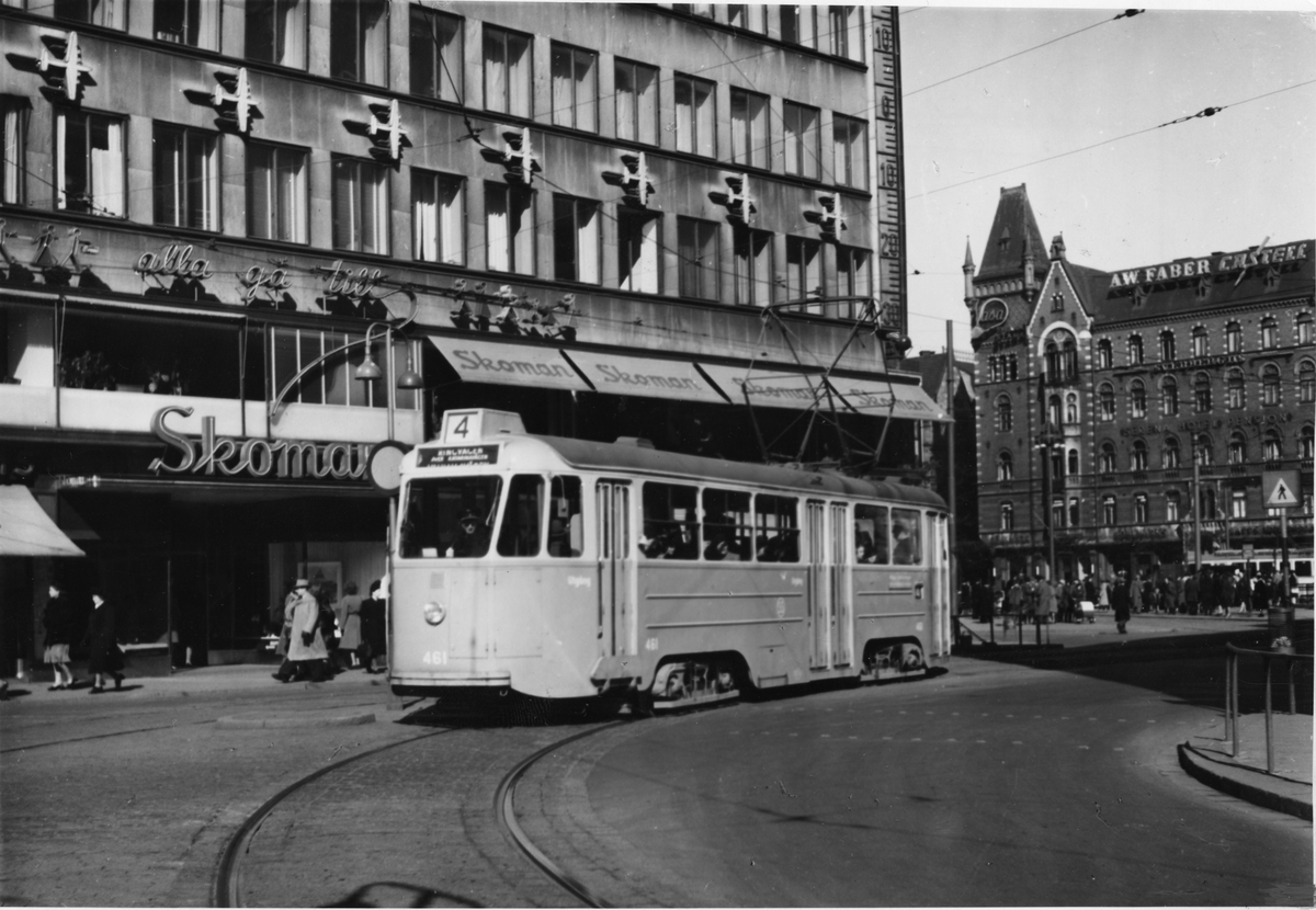 Stockholms spårvägar. Vagn på linje 4 på väg söderut från Norrmalmstorg.