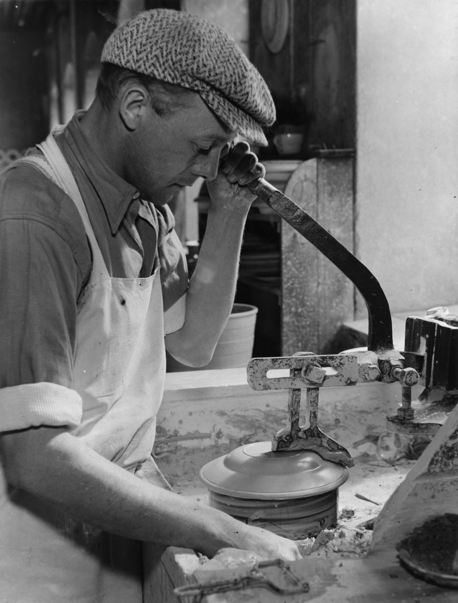Gustavsbergs Porslinsfabrik. Drejning av en tallrik medelst en stålschablon över en roterande gipsform. En man med medhjälpare kan forma 1400 tallrikar om dagen på dylikt sätt.
