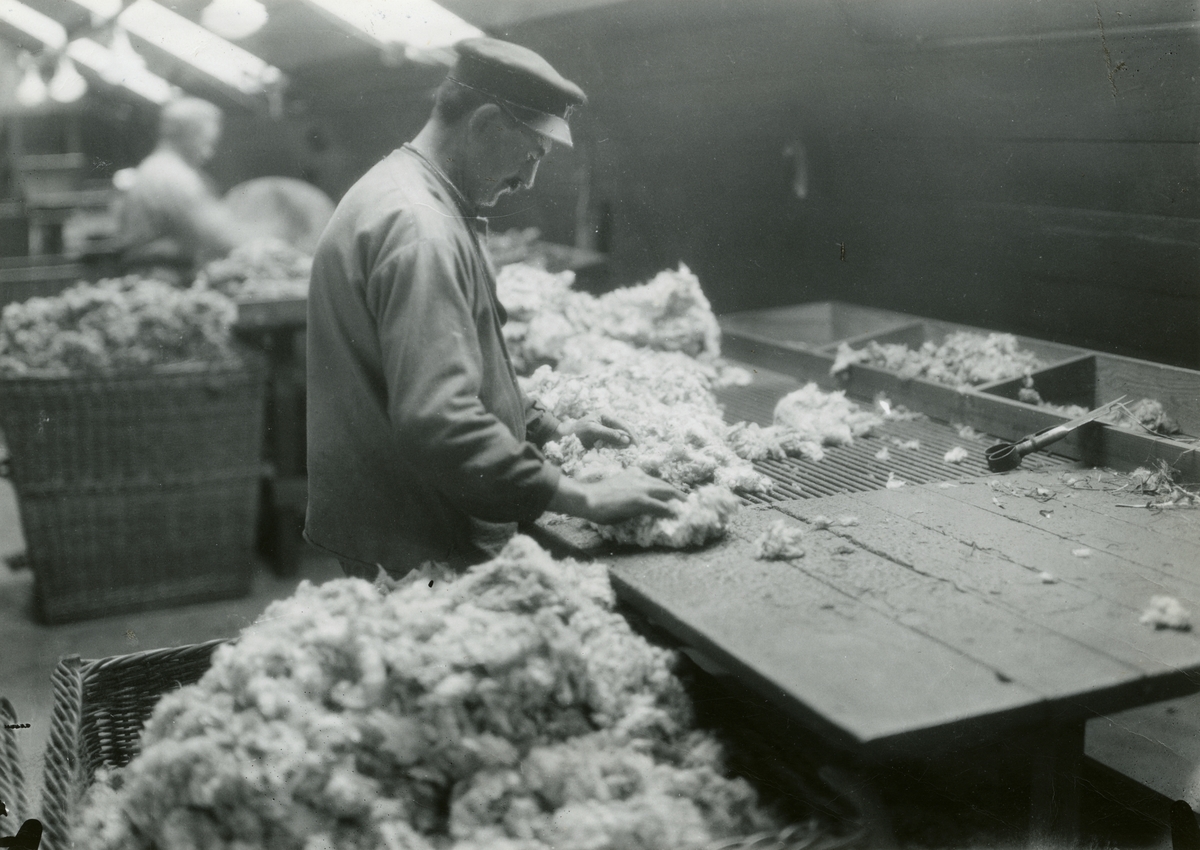 AB Förenade Yllefabrikerna i Norrköping. Ullsorterare i arbete.