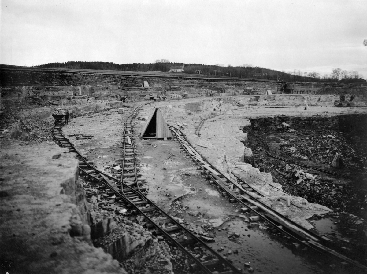 Aktiebolaget Gullhögens Bruk. Stenbrottet från söder. Vita byggnaden i bakgrunden Svenningsgården.