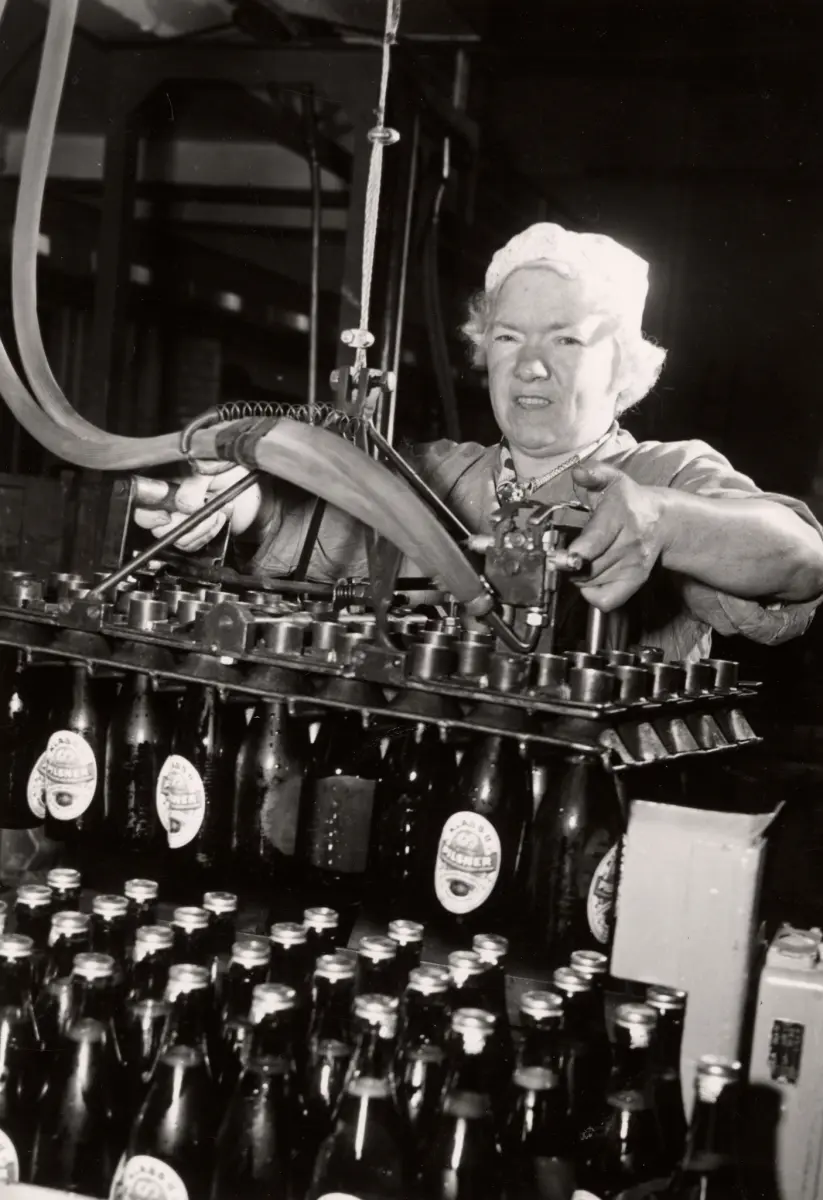 Bryggeriarbetare. Bilden märkt: "En representant för den gamla stammen av bryggarkullor manövrerar lätt automatiska lådfyllare vid Stockholms Bryggerier".
