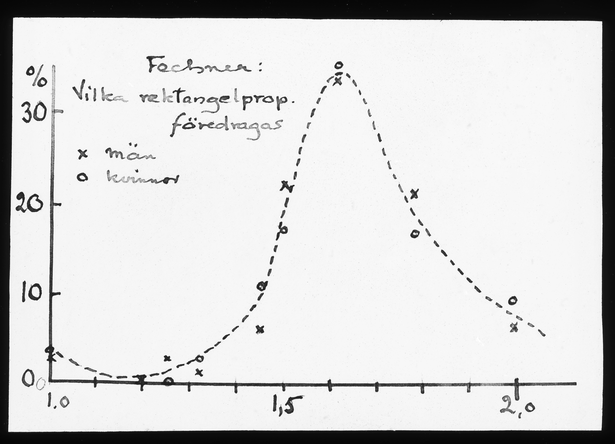 Skioptikonbild från institutionen för fotografi vid Kungliga Tekniska Högskolan. Använd av professor Helmer Bäckström som undervisningsmaterial. Bäckström var Sveriges förste professor i fotografi vid Kungliga Tekniska Högskolan 1948-1958. Grafisk framställning av Fechners resultat ang undersökning kring gyllene snittet. För mer info: Se Fotografisk Handbok av Helmer Bäckström. Natur och Kultur. Andra omarbetade upplagan 1958-59. Sid 913.