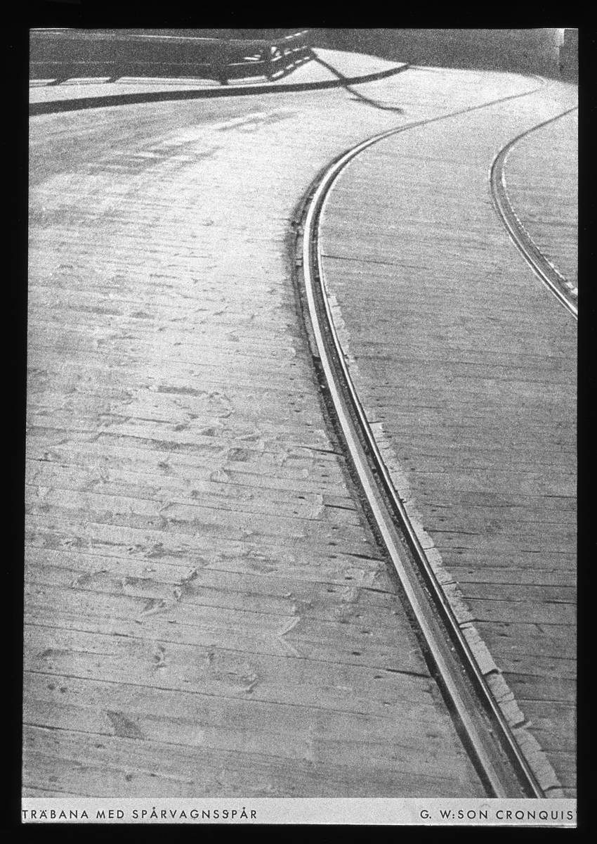 Skioptikonbild från institutionen för fotografi vid Kungliga Tekniska Högskolan. Använd av professor Helmer Bäckström som undervisningsmaterial. Bäckström var Sveriges förste professor i fotografi vid Kungliga Tekniska Högskolan 1948-1958. Spårvagnsspår.