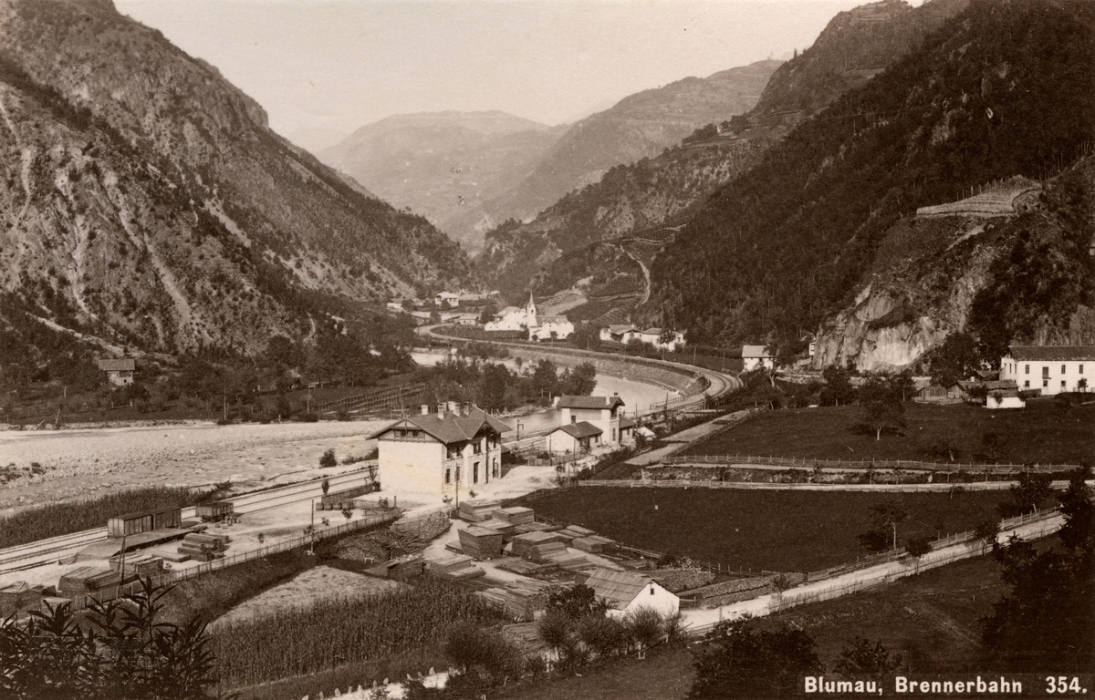 Vy över Blumau i Sydtyrolen längs järnvägen Brennerbahn.