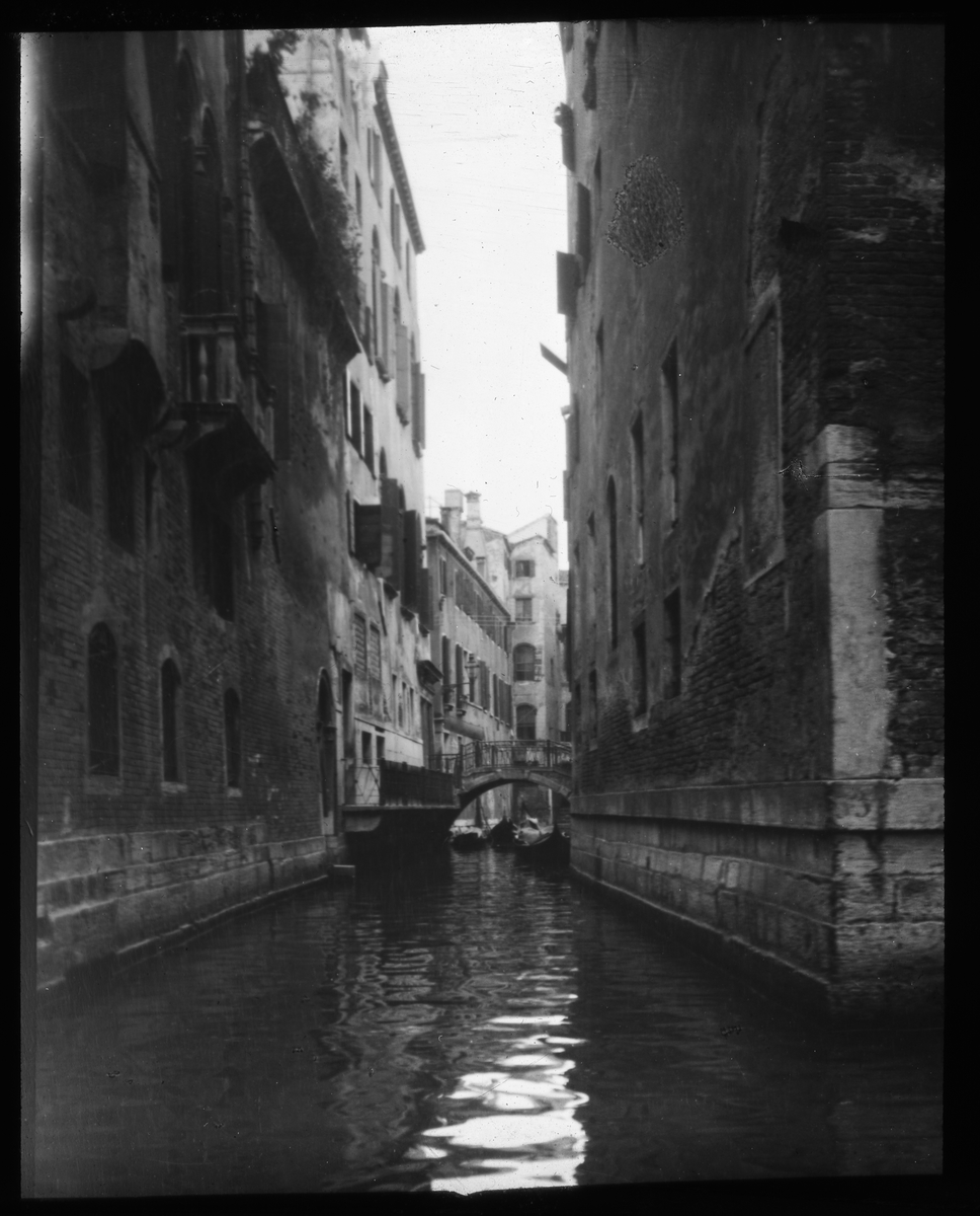Skioptikonbild från institutionen för fotografi vid Kungliga Tekniska Högskolan. Motiv föreställande kanal i Venedig. Bilden är troligen tagen av John Hertzberg under en resa i Europa.