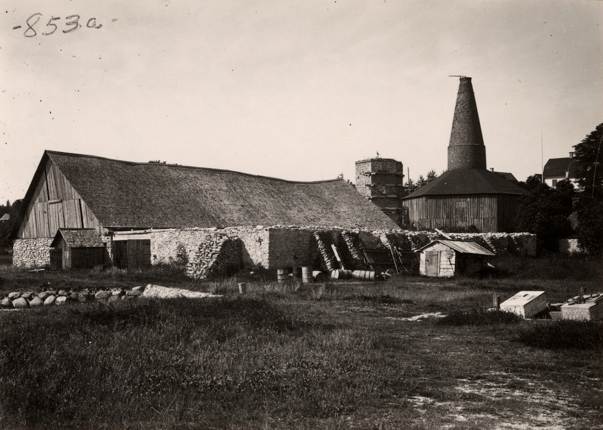 Till vänster kalklada, i bakgrunden vedeldad schaktugn. Till höger koleldad schaktugn.