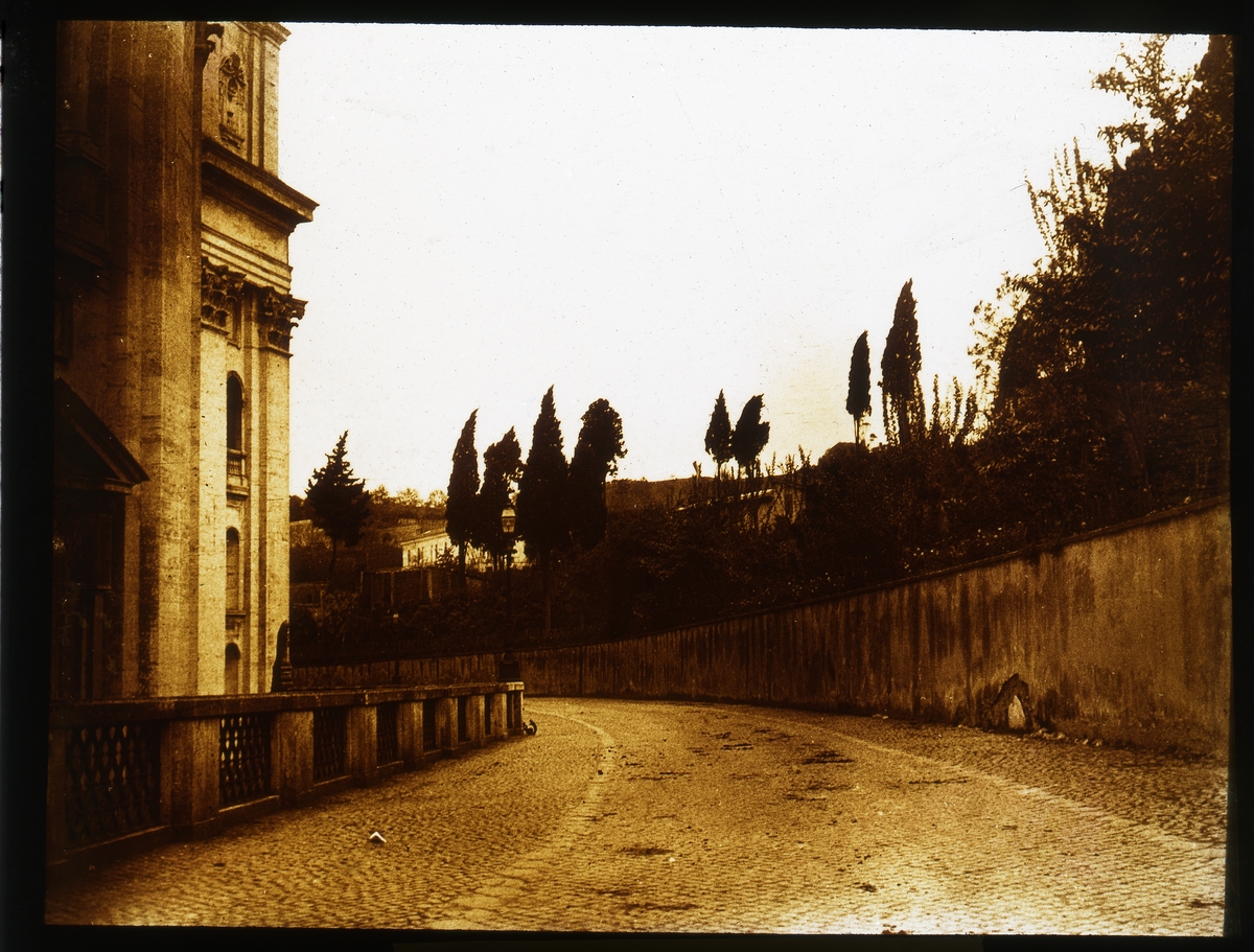 Skioptikonbild från institutionen för fotografi vid Kungliga Tekniska Högskolan. Motiv föreställande en väg i Rom. Bilden är troligen tagen av John Hertzberg under en resa i Europa. (Silveromvandling, pga fukt och luft, kan ha gett bilden den gulbruna färgen.)