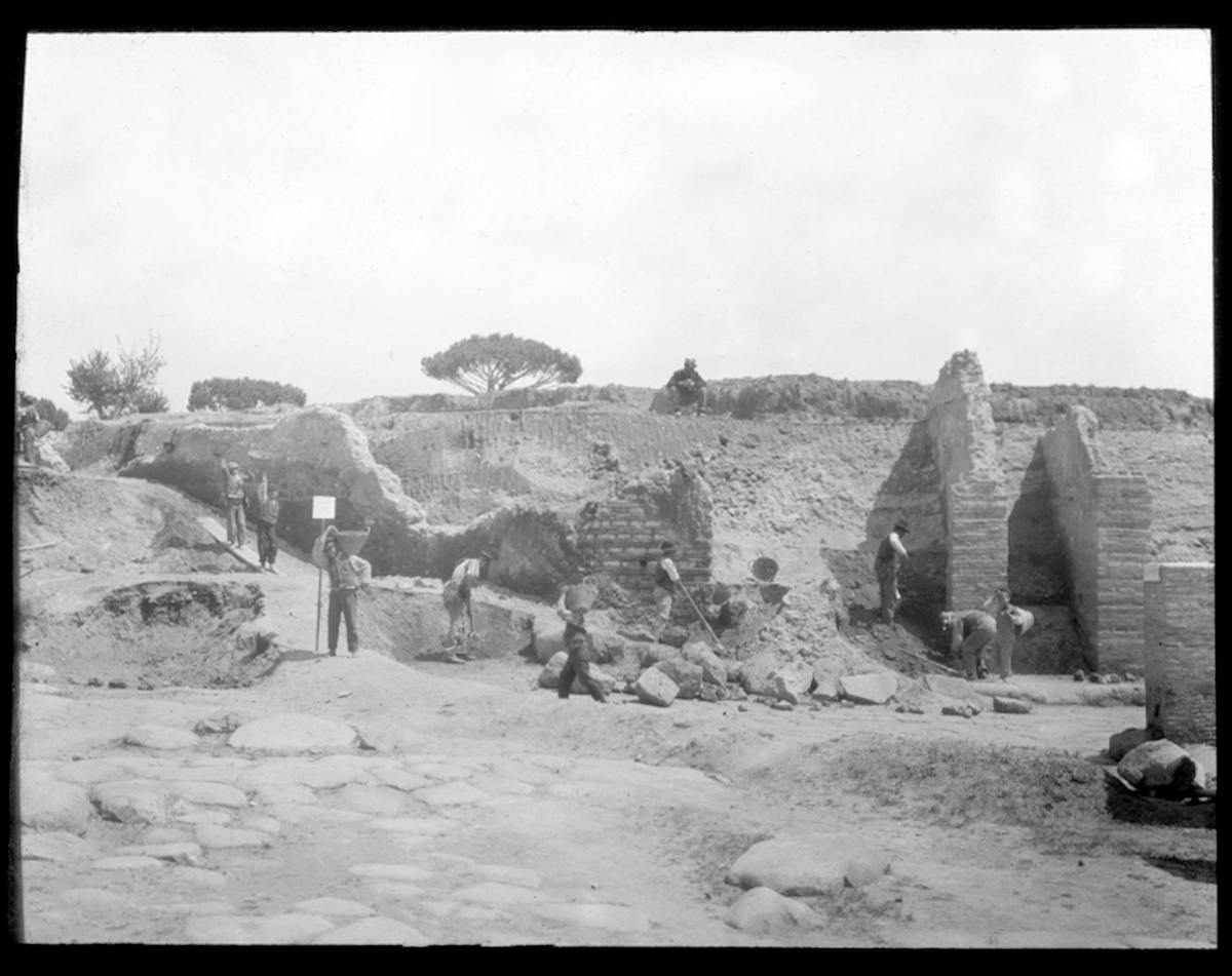Skioptikonbild från institutionen för fotografi vid Kungliga Tekniska Högskolan. Motiv föreställande en asrkeologisk utgrävning. Bilden är troligen tagen av John Hertzberg under en resa i Europa.