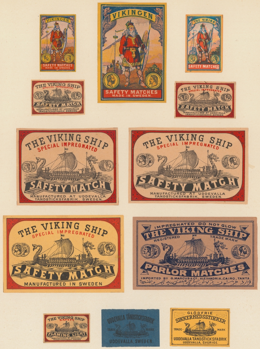 Etiketter för tändsticksaskar, från Svenskt Industri- och Handelsmuseum.