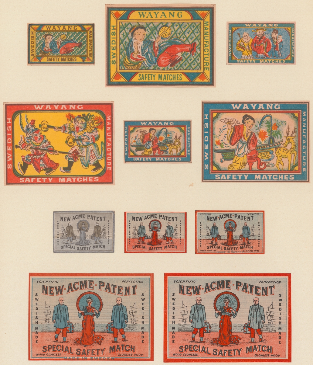 Etiketter för tändsticksaskar, från Svenskt Industri- och Handelsmuseum.