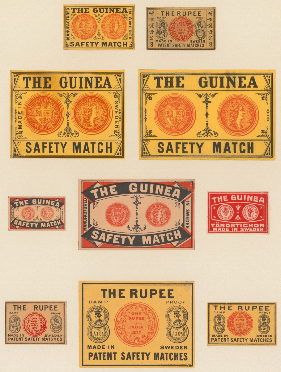 Etiketter för tändsticksaskar, från Svenskt Industri- och Handelsmuseum.