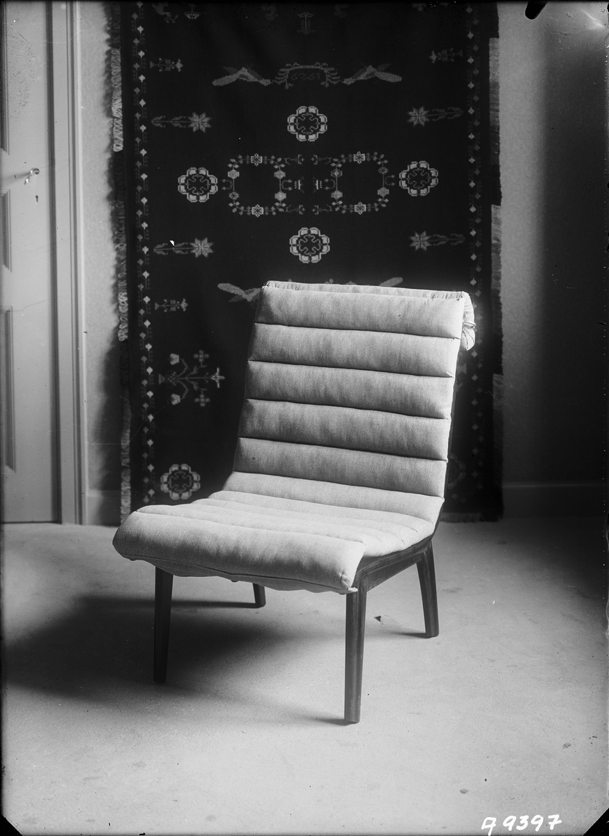 Hantverkets propagandautställning: Stol med matta i bakgrunden.