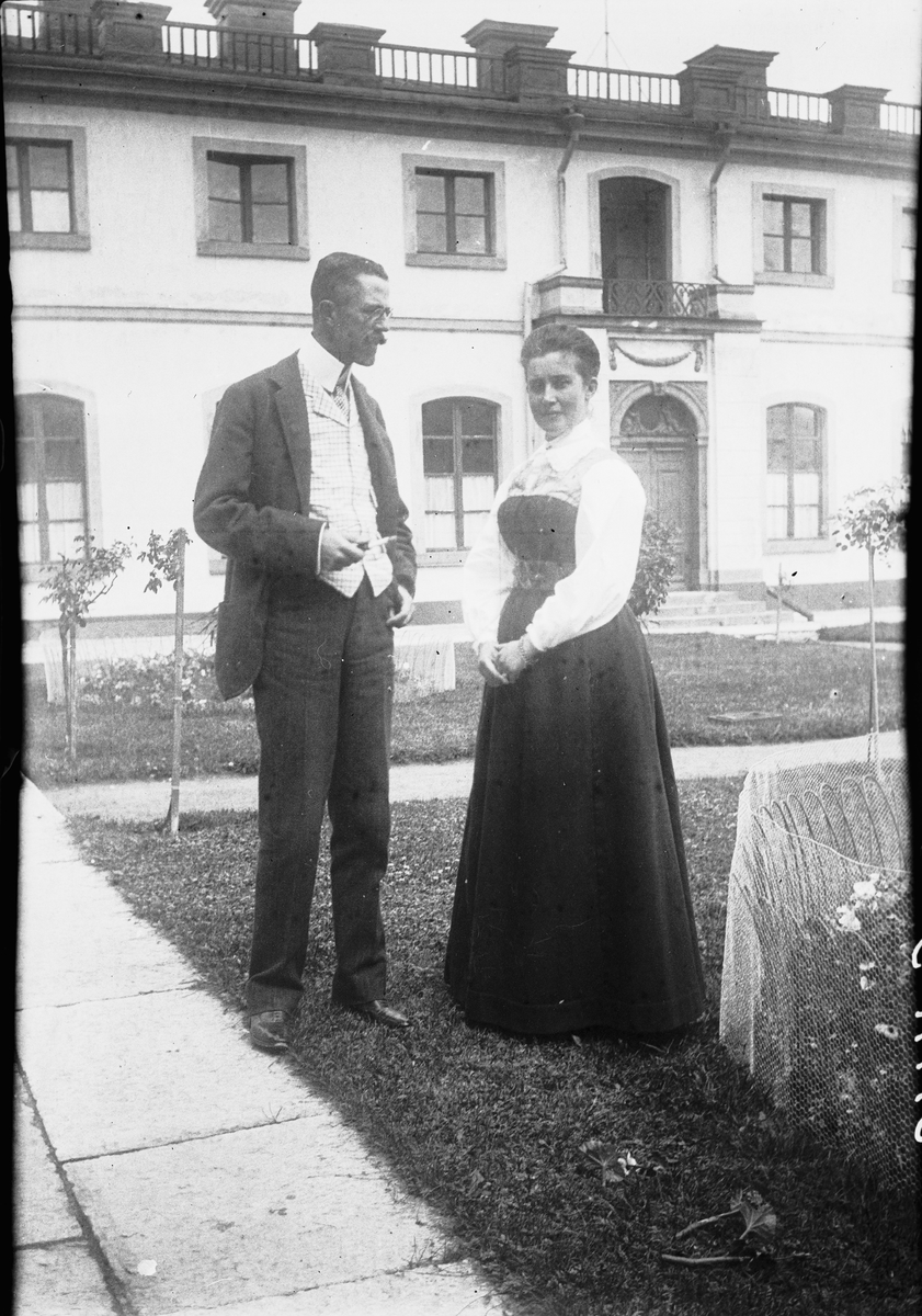 Drottning Victorias bilder. Konungen, Gustav V och dam i Tullgarnsdräkt, på Tullgarns slott.