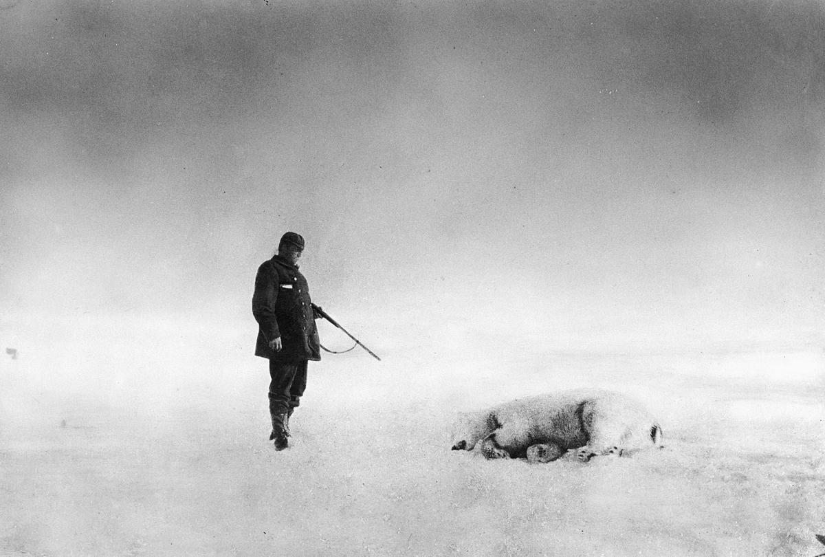 Andrée vid en fälld björn. Bilden tagen sannolikt den 19 juli 1897. Framtagning av bilderna gjordes av docent John Hertzberg år 1930 på Fotografi, Tekniska Högskolan.