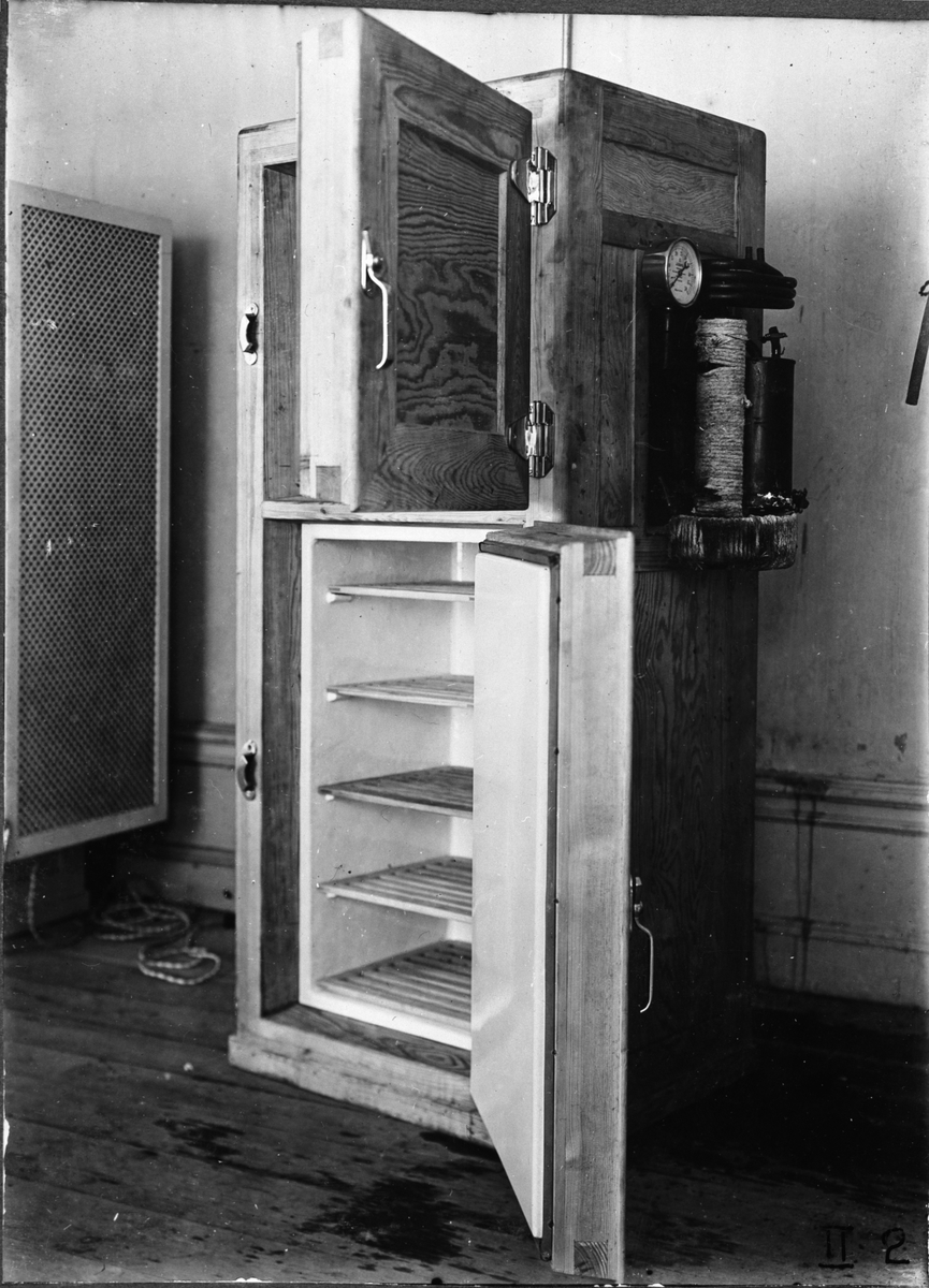 Elektrolux-Laboratoriet. Kylskåp med första experiment apparat från Riddaregatan.