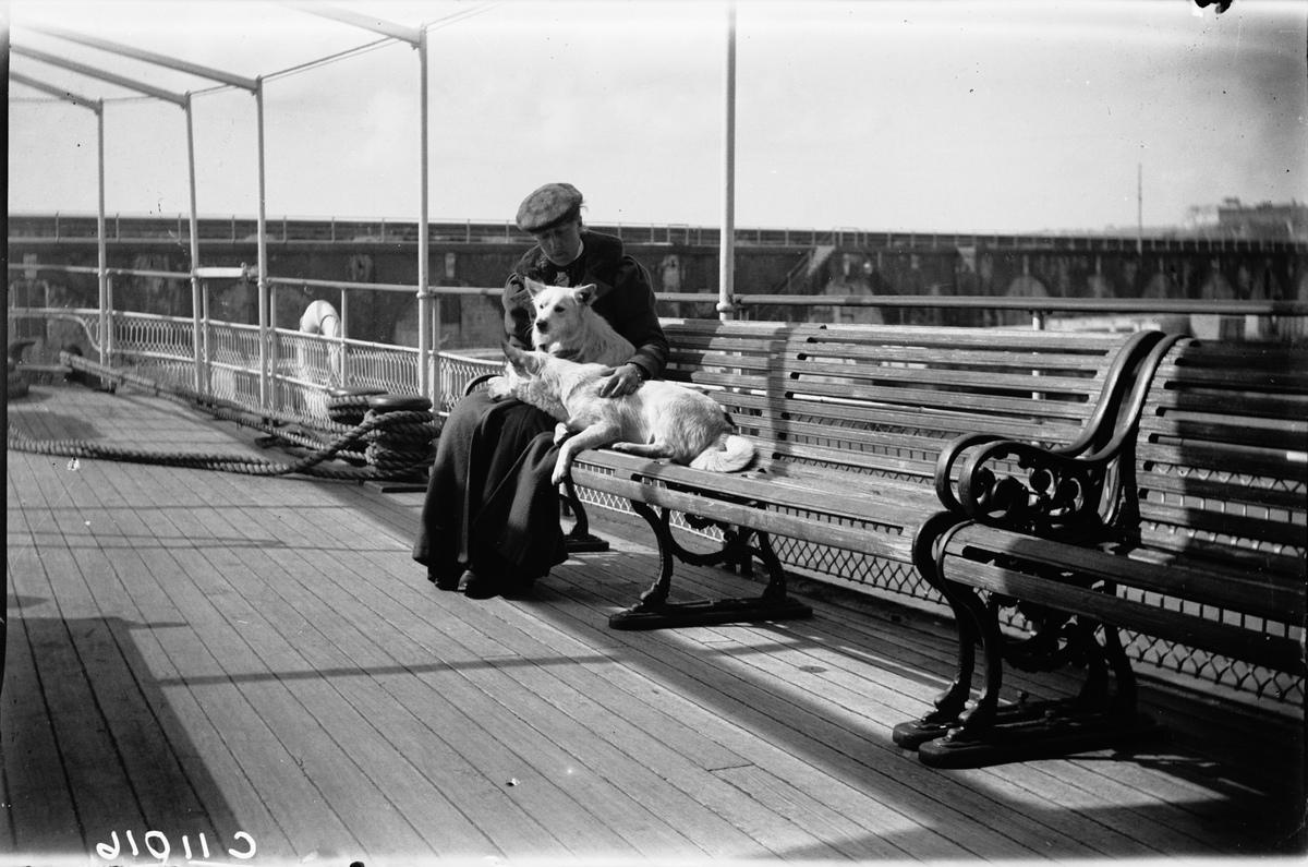 Drottning Victorias bilder. Kvinna sittande på båt med tvåhundar.