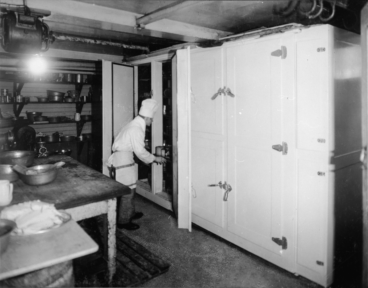6 kylskåp i ett hölje. Storköksinteriör med kock.