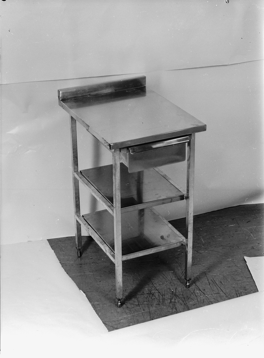 Arbetsbord med låda och hyllor, i rostfri plåt.