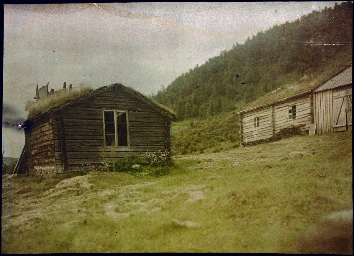 Agfa-autokrom. Timmerhus med grästak. Grundfors vid Gikasjön, Västerbottens inland.
