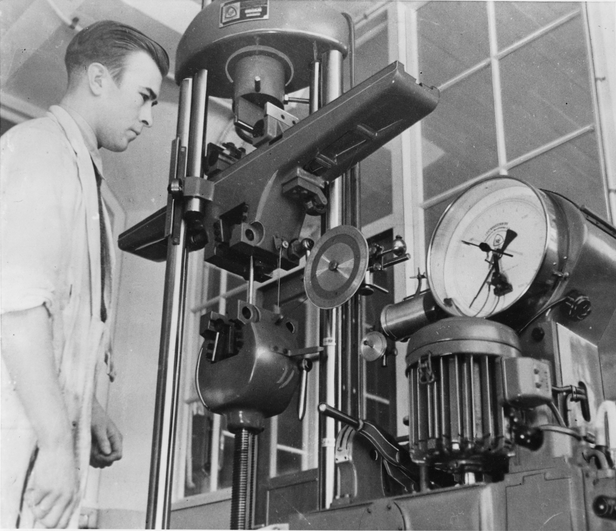 Husqvarna Vapenfabriks AB. Järnets hållfasthet provas medelst moderna maskiner i laboratoriet, 1942.
