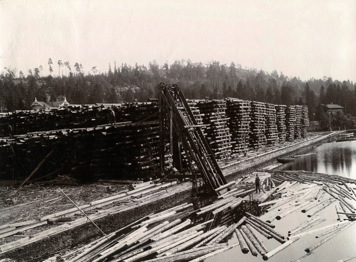 Dals Ångsåg vid Ångermanälven 1898. Timmeruppfordring för vintersågning.