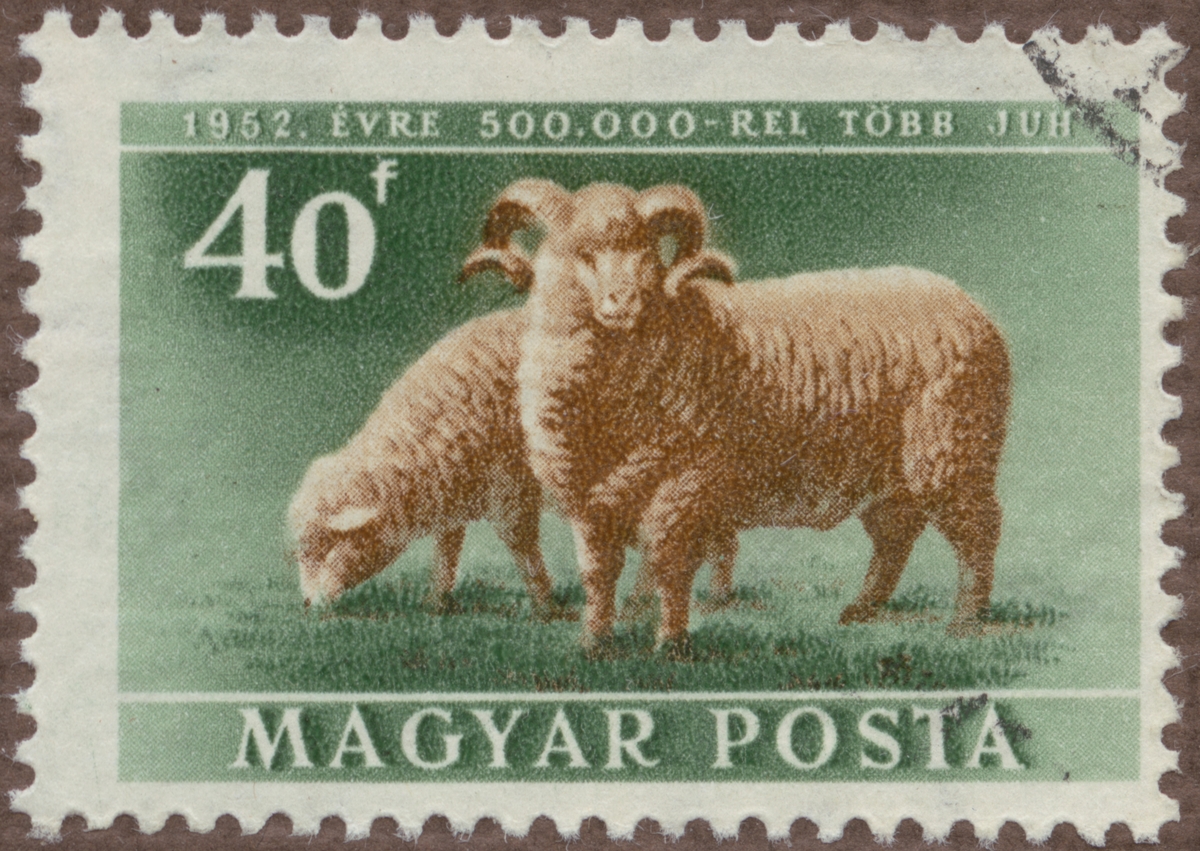 Frimärke från Ungern, 1951. Motiv av Bagge med tacka 1952 - 500.000 -Propaganda för ökad husdjursavel-