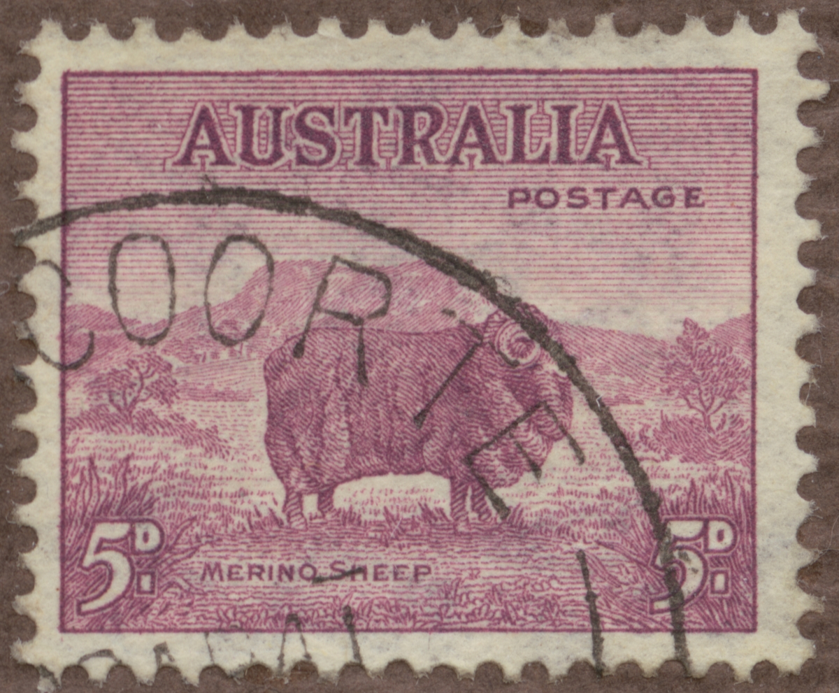 Frimärke från Australien, 1934. Motiv av Ullfår. Bagge av Merinoras - Honnör för Capt. John Macarthur: (1767-1834) som grundlade New South Wales´ ullindusti. - 100-årsminne av Macarthurs död. 1834-1934.